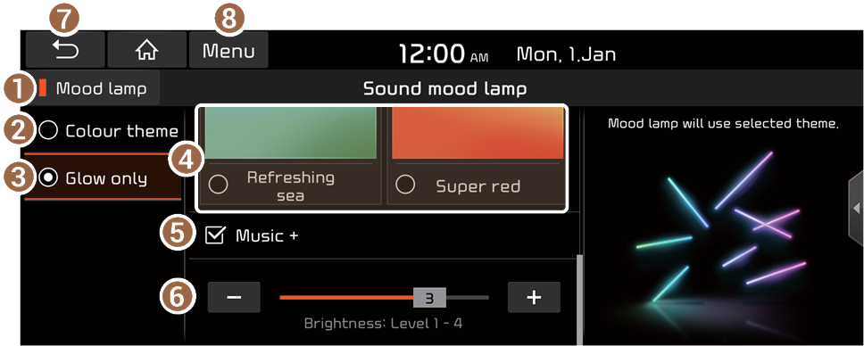 - Can select various colour themes. Based on the selected colour theme, the interior lighting changes its colours in various patterns.